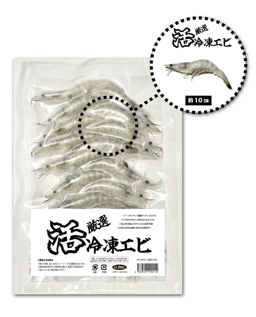 厳選「活冷凍エビ」のメリットは、外気を遮断して保管できるので、ほぼ劣化しません。V.I.SOULの検証では、三年間はそのままの状態をキープできました。冷凍庫に数パック保存して、釣りに行きたい時にいつでも簡単に使用できるのが一番の特徴です。また、ユーザー様から「他の冷凍エビよりアタリが多い」とご報告いただいてます。変色を防止する添加剤などは使用せず、エビが持つ本来の旨味を損なわない厳選「活冷凍エビ」。それを食べる魚、魚を食べる人に配慮した、おすすめの冷凍エビです。