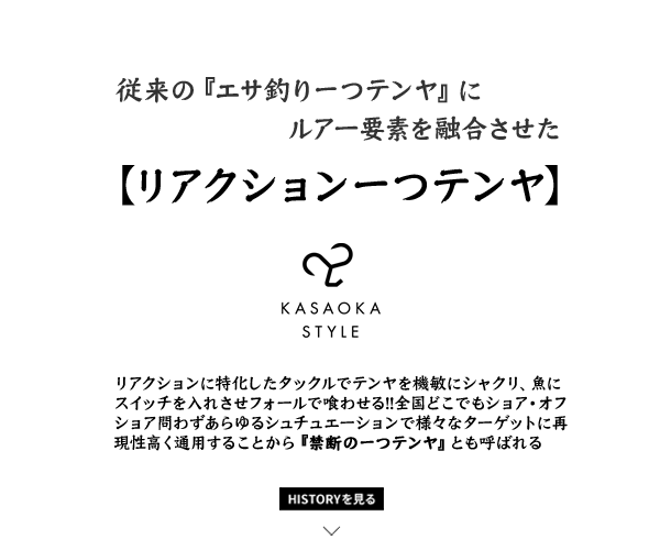 ───リアクション一つテンヤ「笠岡スタイル」とは、従来の一つテンヤ釣法に、ルアーフィッシングの要素を融合した、新発想、新感覚のメソッドです。V.I.SOUL創業以前より、一つテンヤの概念がない岡山県笠岡沖で着想、あまたの検証が続けられ実績を上げてきました。そこが始まりです。「笠岡スタイル」は、基本、活きエビを使用し、テンヤを機敏にシャクリ魚にスイッチを入れ、テンションフォールでバイトを誘発させます。イメージは、猫じゃらしに猫が反応(リアクション)するメカニズムと同じです。エサとなる活きエビを使用し、食性に訴える。それプラス、リアクションの要素で威嚇を促す。この二つの融合により、今までの常識が次々と塗り替えられました。